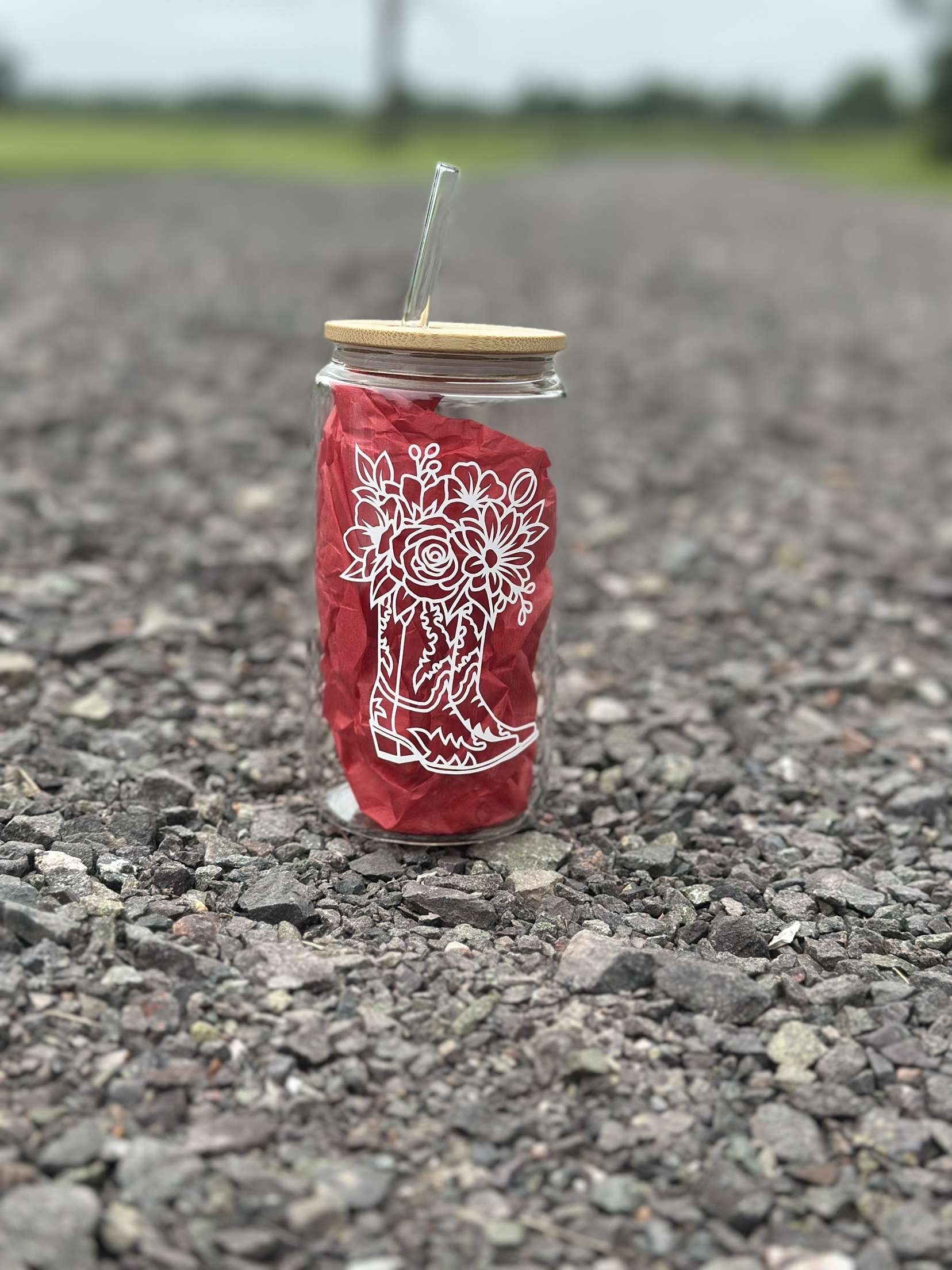 cute glass cup with cowboy boots on one side and the famous “blame it all on my roots” quote on the other side.